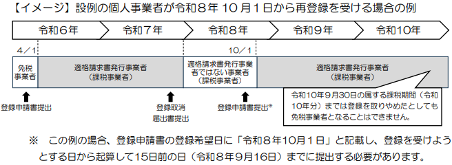 この設例の場合、令和8年まではインボイス発行事業者でなくても消費税の課税事業者に該当します(2年を経過する日の属する課税期間までは免税事業者にはなれないため)。そのため、イメージ図どおり、インボイス発行事業者であるかどうかにかかわらず、ずっと課税事業者です。また、再登録したことによって、そこから2年は免税事業者にはなれない、というケースです。