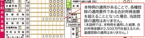 国税庁「特定の基準所得金額の課税の特例の適用がある場合の記載例」https://www.nta.go.jp/taxes/shiraberu/shinkoku/kisairei/pdf/tokutei.pdf - 基礎控除が使えない(設例では合計所得金額が2,500万円を超えるから)