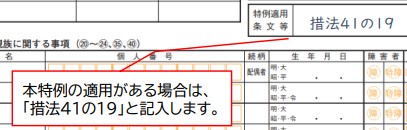 国税庁「特定の基準所得金額の課税の特例の適用がある場合の記載例」https://www.nta.go.jp/taxes/shiraberu/shinkoku/kisairei/pdf/tokutei.pdf - 特例適用条文の記載(措法41の19)